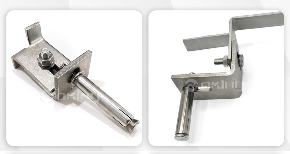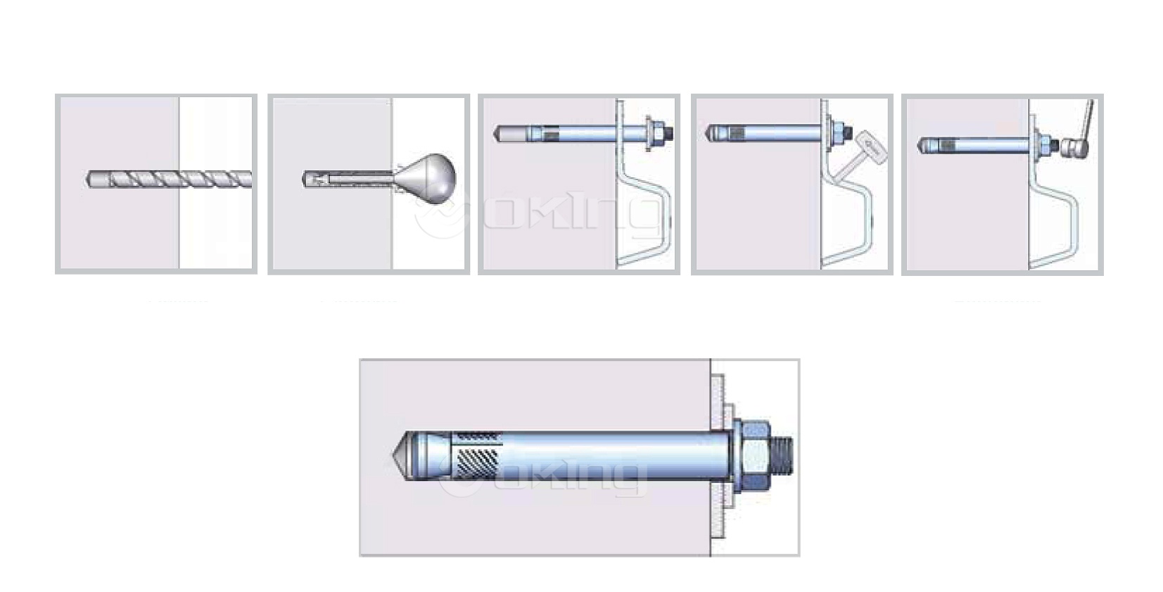 ●Bor lubang pada beton menggunakan bor palu dan mata bor batu berujung karbida yang sesuai dengan ANSI B94, 12-77, dengan diameter yang sama dengan jangkar baji. Jika perlengkapan yang memegang sudah terpasang dan digunakan sebagai templat untuk menemukan lubang dudukan pada perlengkapan harus memberikan jarak untuk klip baji universal pada tiang.